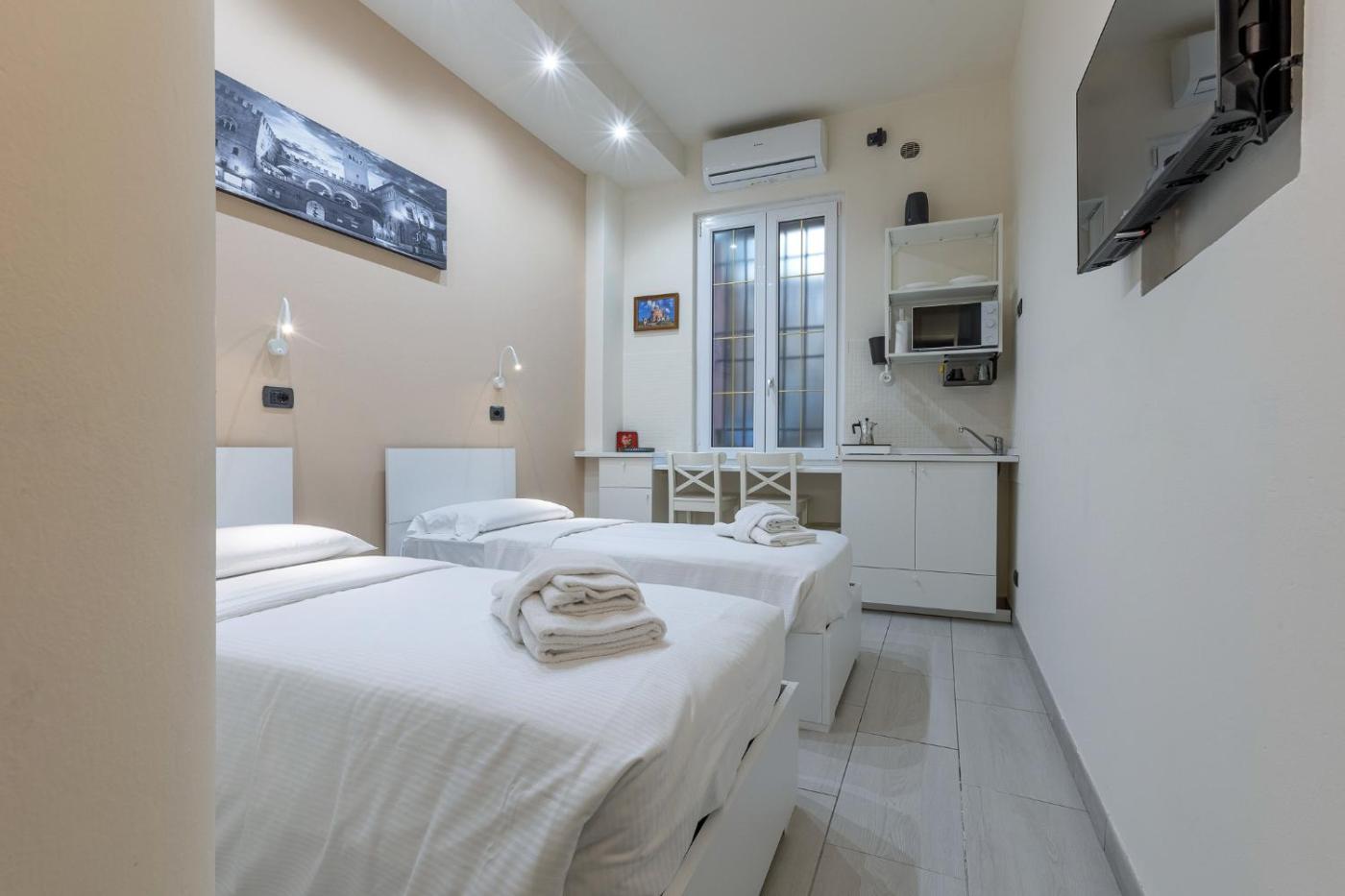 Twin Room. The twin room provides air conditioning, a tiled floor, as well as a private bathroom featuring a shower and a bidet. The well-equipped kitchenette features a stovetop, a refrigerator and kitchenware. This twin room offers a flat-screen TV. The unit offers 2 beds.